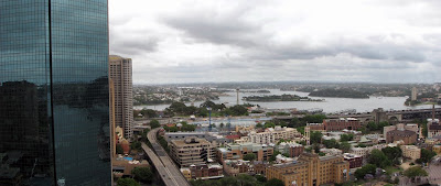 On Sunday I attended Open Sydney 08, where a bunch of historic and interesting buildings across Sydney are opened to the public. The first building we visited was the AMP Tower at Circular Quay and its from the 26th floor of this building that I took these two panoramas. You can see them a bit bigger if you click on them.